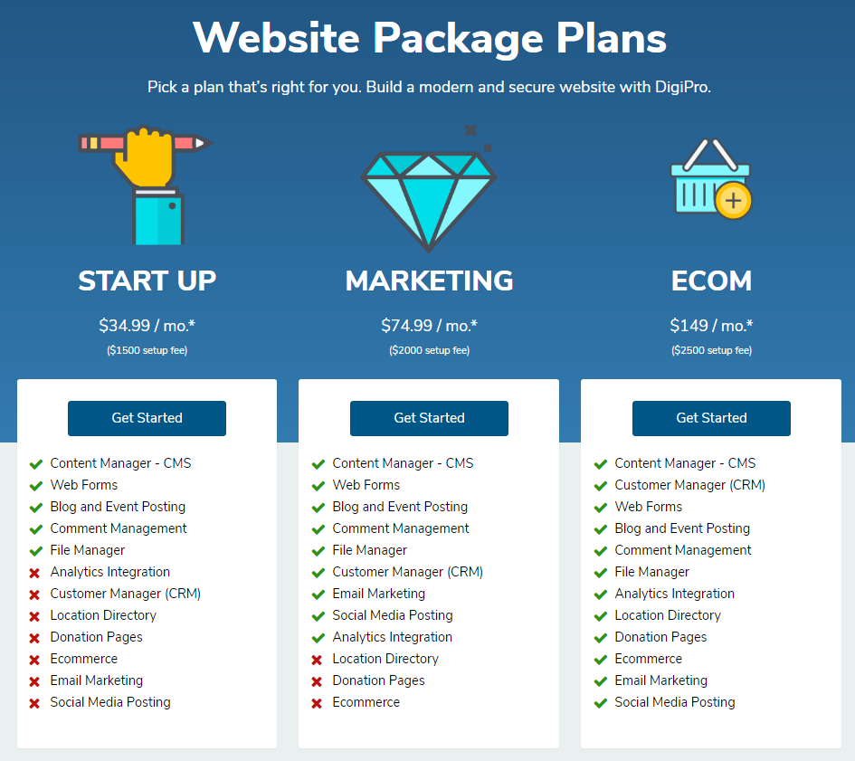 1. The first page is where you choose your "Package Plan". What features do you want your website to have? Remember, you can always contact us at support@digipaas.com if you have any questions. Once you have chosen the package that best suits your website requirements, you can go ahead and click "Get Started" to begin. Piece of cake!