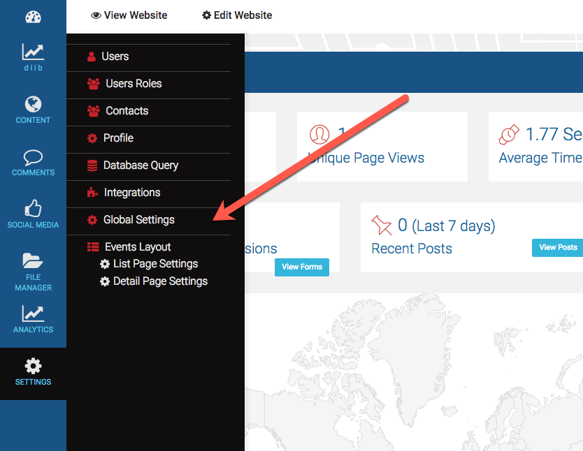 1. Go to your website's Dashboard. Select Settings, then Global Settings.