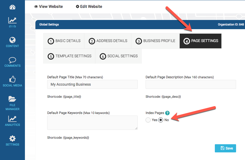 2. In your Global Settings, select the Page Settings tab, and under Index Pages, move the button from No to Yes.