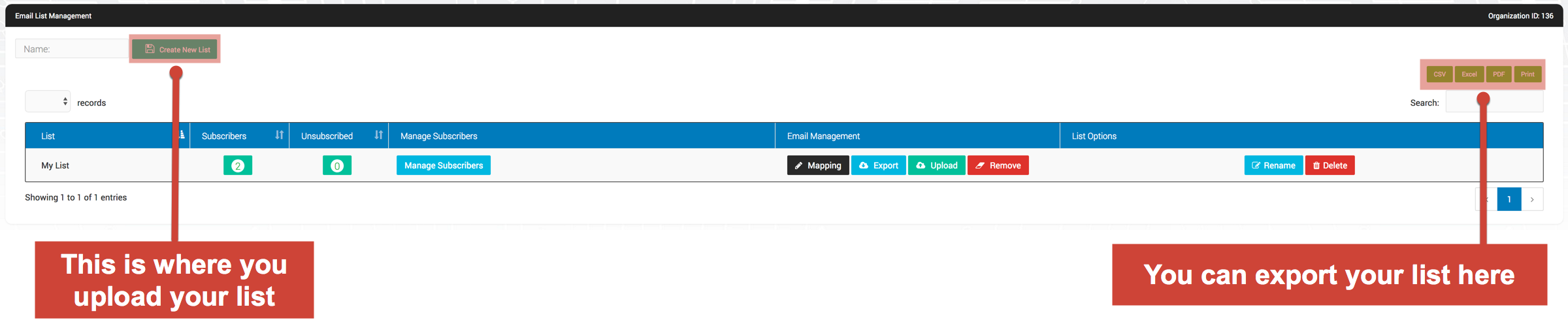When you click on “List Management” a new screen will open, like the one listed below. There will be a box, on the left, that let you load your contact list. The buttons on the right allow you to export your list via .pdf, .csv, excel or just print.