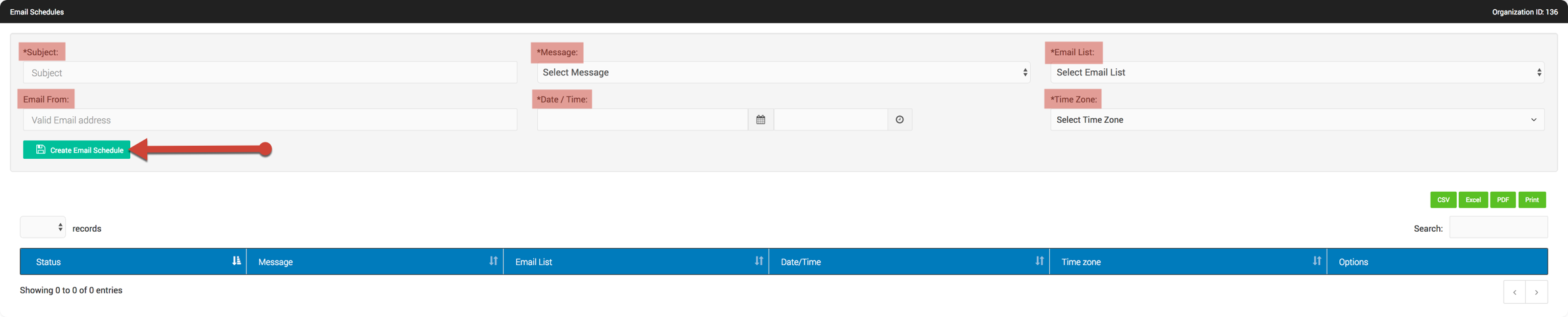 Once the form is completed, click the “Create Email Schedule” button to either send now or to send at a specific time.