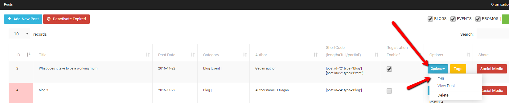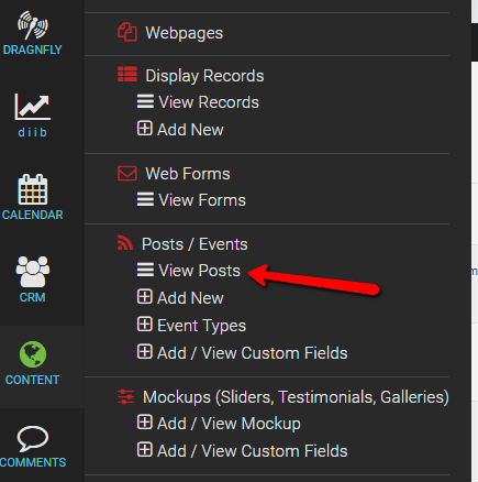 1) Go to Content -> Posts / Events -> View Posts menu items at left vertical menu: