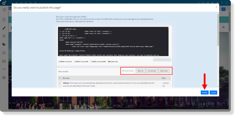 This feature allows the user to view errors, warnings, or notices. This is very important before publishing to the web. If all criteria are met you site will be published without error.