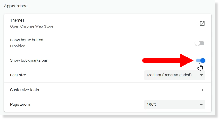 2. Under “Appearances” make sure that “Show Bookmarks Bar” is turned on.